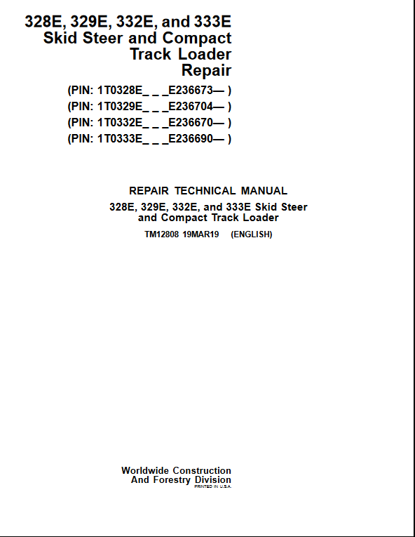 John Deere 328E, 329E, 332E, 333E Skid Steer Repair Technical Manual