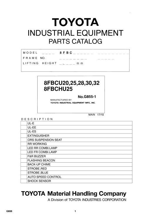 Toyota 8FBCU20,25,28,30,32 & 8FBCHU25 Forklift Parts Catalog